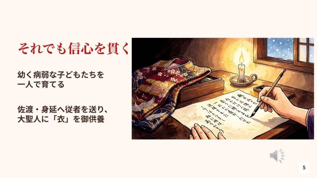 夫を亡くし、子どもたちは病弱、財産も奪われた。そんな状態で、普通なら自分のことで精いっぱいです。それなのに、佐渡や身延に従者を送り、さらには衣まで御供養している。